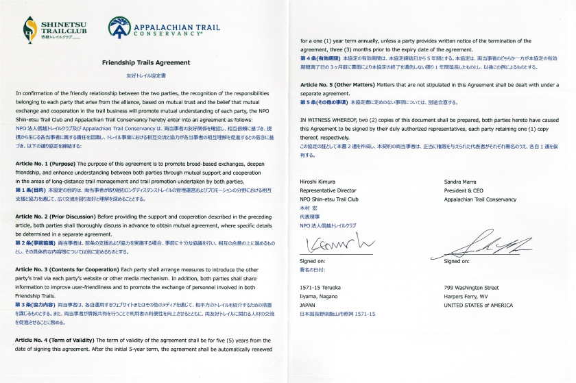 2023年11月、信越トレイルクラブ(STC)とアパラチアントレイルコンサーバンシー(ATC)は、友好トレイル協定を締結しました。