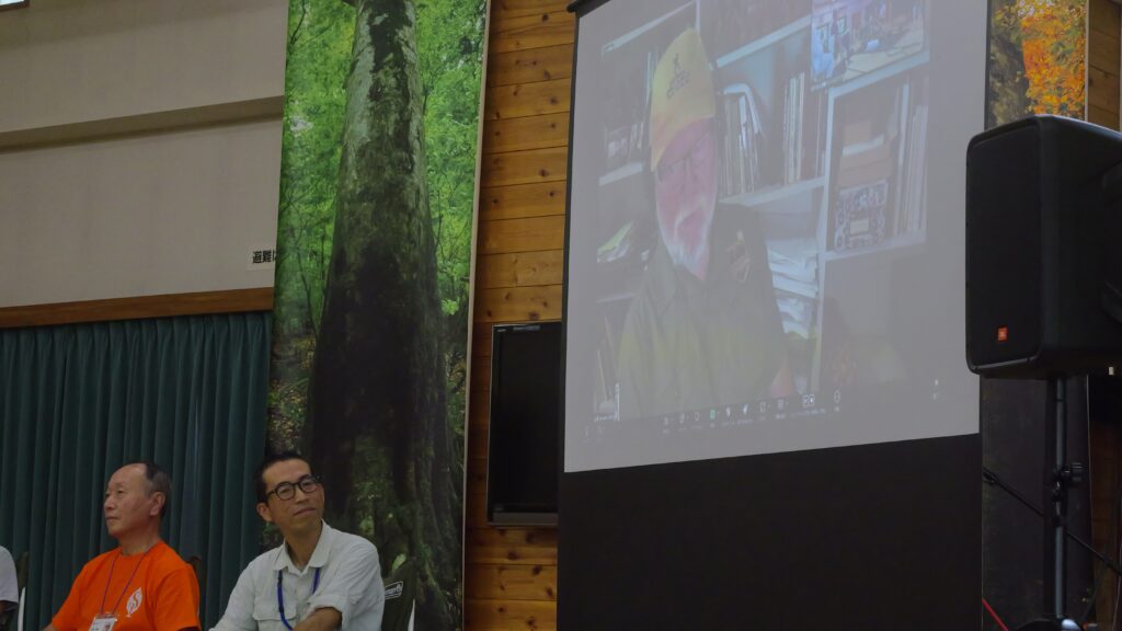 続くディスカッションには、Andreaさんに加え、長野市でアウトドアギアショップNATURAL ANCHORSを営む戸谷悠さん、信越トレイルクラブ登録ガイドの北野博基さんと事務局の鈴木が登壇。また昨年に続きGATCから、保全担当理事のTom LambさんがZoomで参加しました。